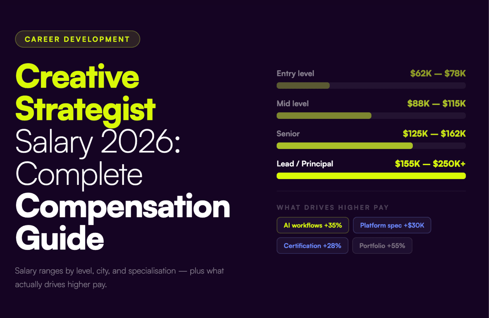 Consider this: creative strategists now earn $62K to $250K+. Explore 2026 salary ranges by level, city, and specialization, plus what actually drives higher pay.